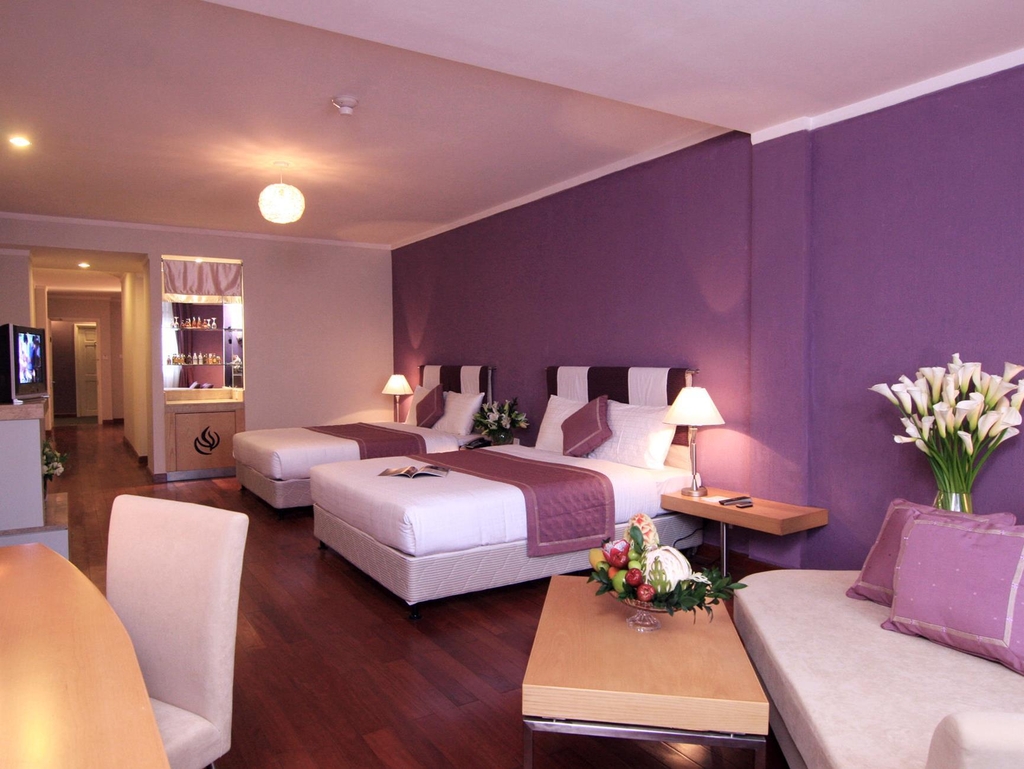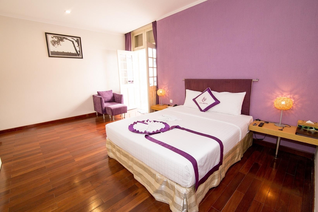 Phòng có diện tích 36 mét vuông với 1 giường ngủ, phù hợp cho 2 người lớn đi theo cặp đôi. Không gian phòng tràn ngập sắc tím và trắng, tô điểm thêm những đèn ngủ vàng. Sàn được lót gỗ khiến căn phòng trở nên hài hòa và tinh tế hơn.