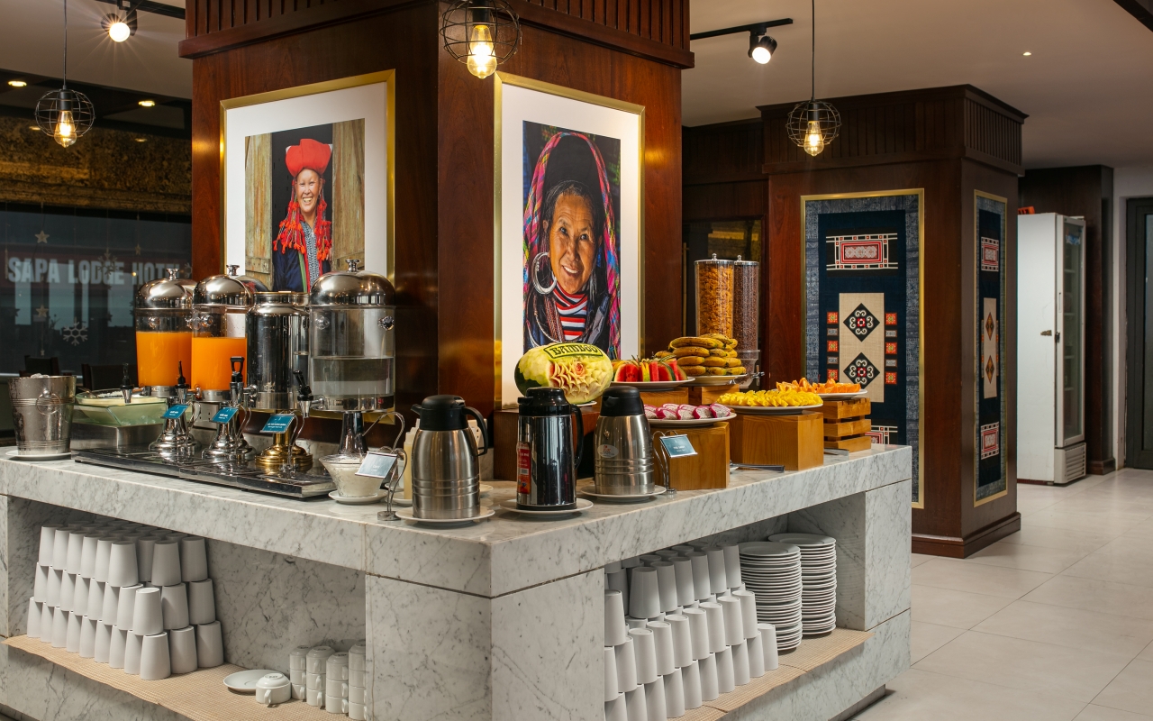 Tiếp đến là không gian nhà hàng Bamboo Sapa Hotel sở hữu view “triệu đô”, chẳng kém cạnh Bamboo Eden, bể bơi vô cực. Với sức chứa lên đến 250 khách, không gian bên trong nhà hàng thiết kế rộng rãi, sang trọng, điểm xuyết thêm màu sắc văn hóa địa phương. Menu đa dạng, phục vụ các món ăn hấp dẫn từ ẩm thực địa phương, tới các món ngon chuẩn vị Á – Âu do các đầu bếp hàng đầu chế biến.
